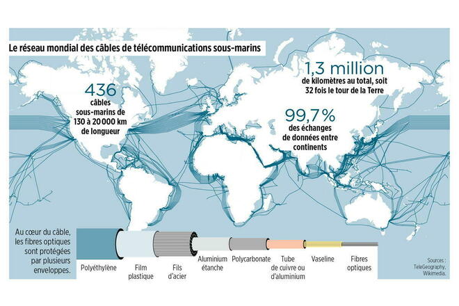 Les câbles sous-marins sont de longues fibres optiques posées au fond des mers, reliant les continents entre eux. Ils permettent le fonctionnement d’Internet, des marchés boursiers, des systèmes bancaires et des communications stratégiques. Une coupure majeure peut isoler un pays en quelques minutes.